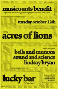 Thanks to everyone who attended our MusiCounts Benefit concert this past Tuesday at Lucky Bar! Especially Lindsay Bryan, Sound and Science, and Bells and Cannons who so kindly volunteered their time and music for this great cause.